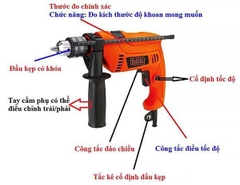 - Đầu khoan: Kẹp 13mm (Sắt: 13mm, Bê tông: 13mm, Gỗ:20mm)