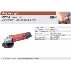 Máy mài góc 570W Maktec MT954 là một trong những sản phẩm nổi bật của thương hiệu này, đây là dòng máy mài cầm tay chuyên nghiệp được sản xuất theo dây chuyền công nghệ Nhật Bản. Sản phẩm được sản xuất hỗ trợ công việc mài, cắt trên các chất liệu gỗ, kim loại và tường.