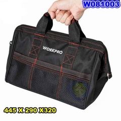 Túi đựng dụng cụ cỡ lớn 18 inch Workpro W081003 có kích cỡ 435 X 400  X 275 mm. Túi gồm 7 ngăn: 3 ngăn lưới, 3 ngăn nhỏ và 1 ngăn to có khóa. Túi màu đen, tên thương hiệu Workpro được thêu nổi bật. Với thiết kế thông minh, sản phẩm vừa giúp người sử dụng thoải mái đựng đồ đạc mà vừa bắt mắt, có tính thẩm mỹ cao.