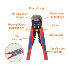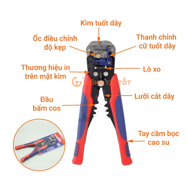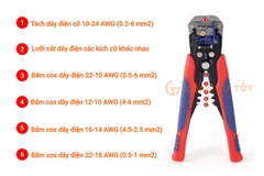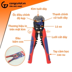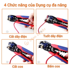 - Nhiều chức năng được tích hợp trên cùng một sản phẩm: cắt dây điện, tuốt vỏ dây điện, cắt cos, bấm cos thích hợp với các công việc đấu nối đường dây, sửa chữa, bảo trì điện gia dụng.